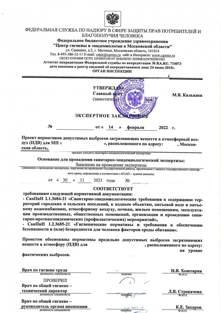 Очередная успешная экспертиза разработанного ООО "ЭкоТехПром групп", проекта ПДВ/НДВ, о чем свидетельствует выданное ФБУЗ "Центр гигиены и эпидемиологии в Московсокй области" экспертное заключение о соответствии данного проектасаниатрным нормам и правилам в РФ.