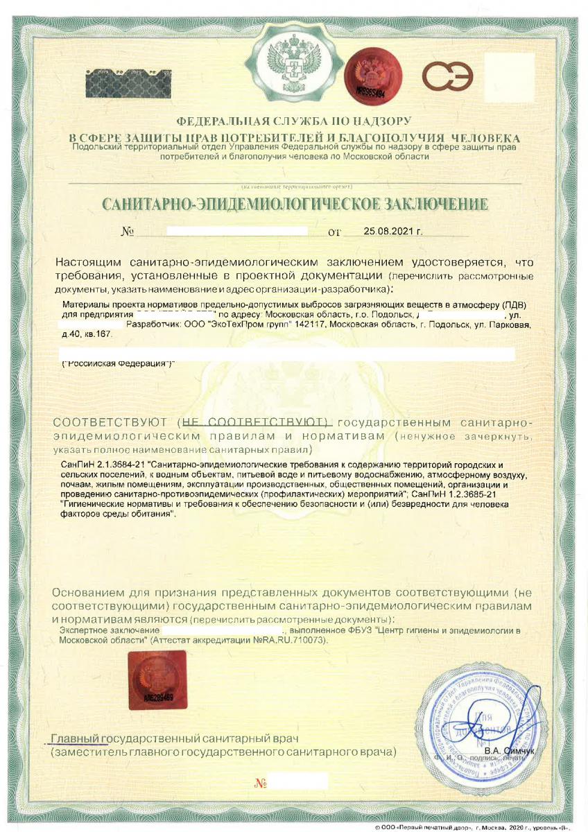Разработанные специалистами ООО "ЭкоТехПром групп" проекты Нормативов допустимых выбросов (НДВ, ПДВ), успешно согласованы в территориальном Управлении Роспотребнадзора. Нашим клиентам: 2 складских комплекса и одна типография, выданы Санитарно-эпидемиологические заключения на соответсвия Государственным правилам и нормативам.