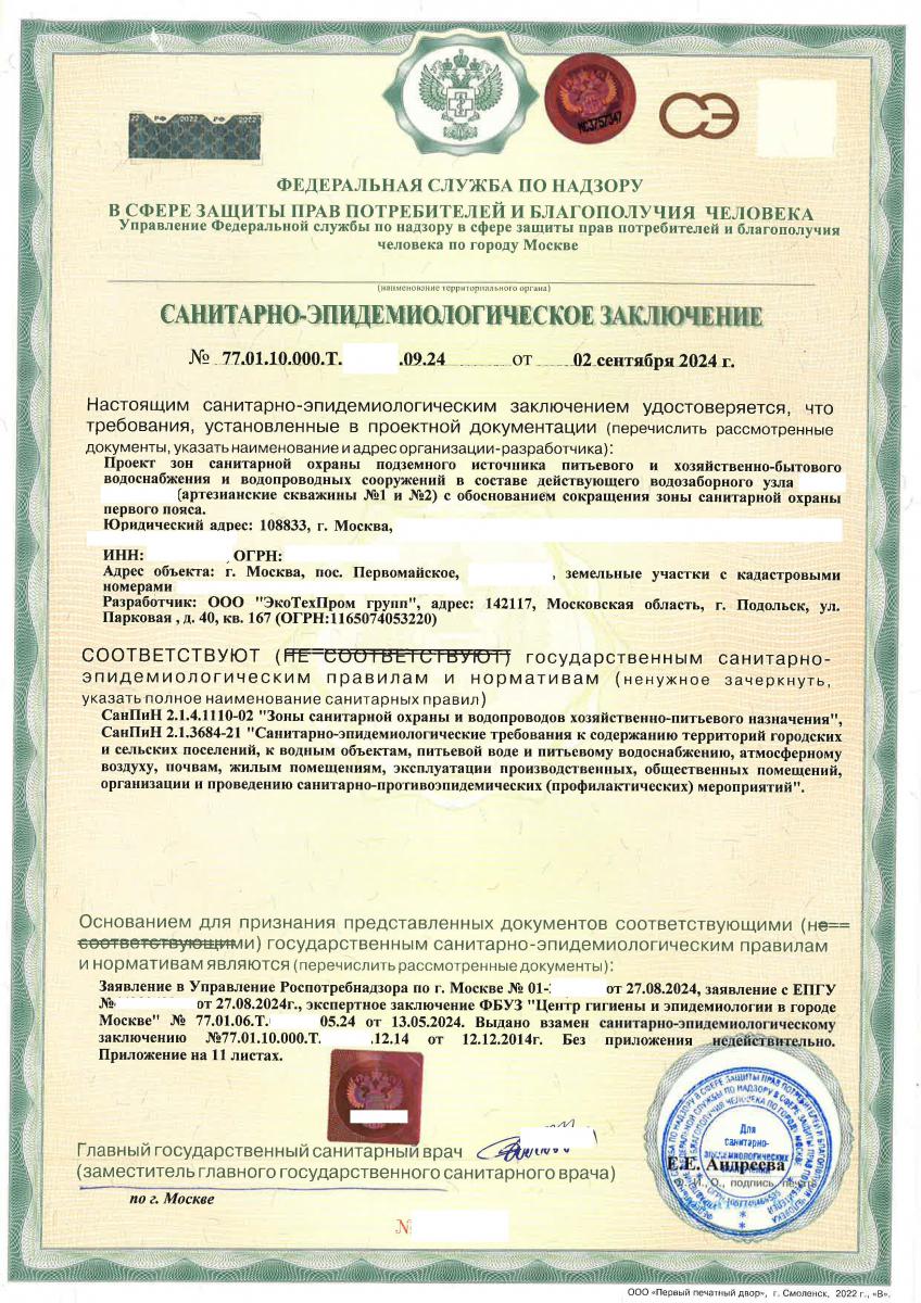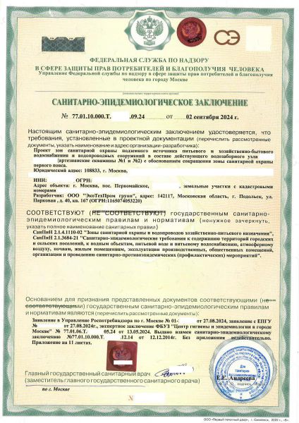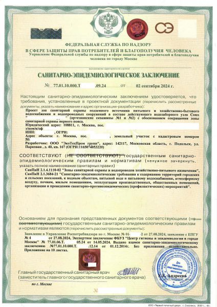 Не частая для нашей компании работа, но и здесь, взявшись за нее, мы подтвердили, что и вопросы по питьевой воде нашими сотрудниками решаемы, совсем недавно мы получили в Управлении Роспотребнадзора положительные санитарно-эпидемиологические заключения на разработанные ранее и успешно пройденные экспертизы, проекты зон санитарной охраны питьевой скважины, все представленные материалы, соответствуют требованиям действующего Законодательства РФ. Данные скважины, расположены в г. Москве служат для обеспечения питьевой водой коттеджных поселков.
