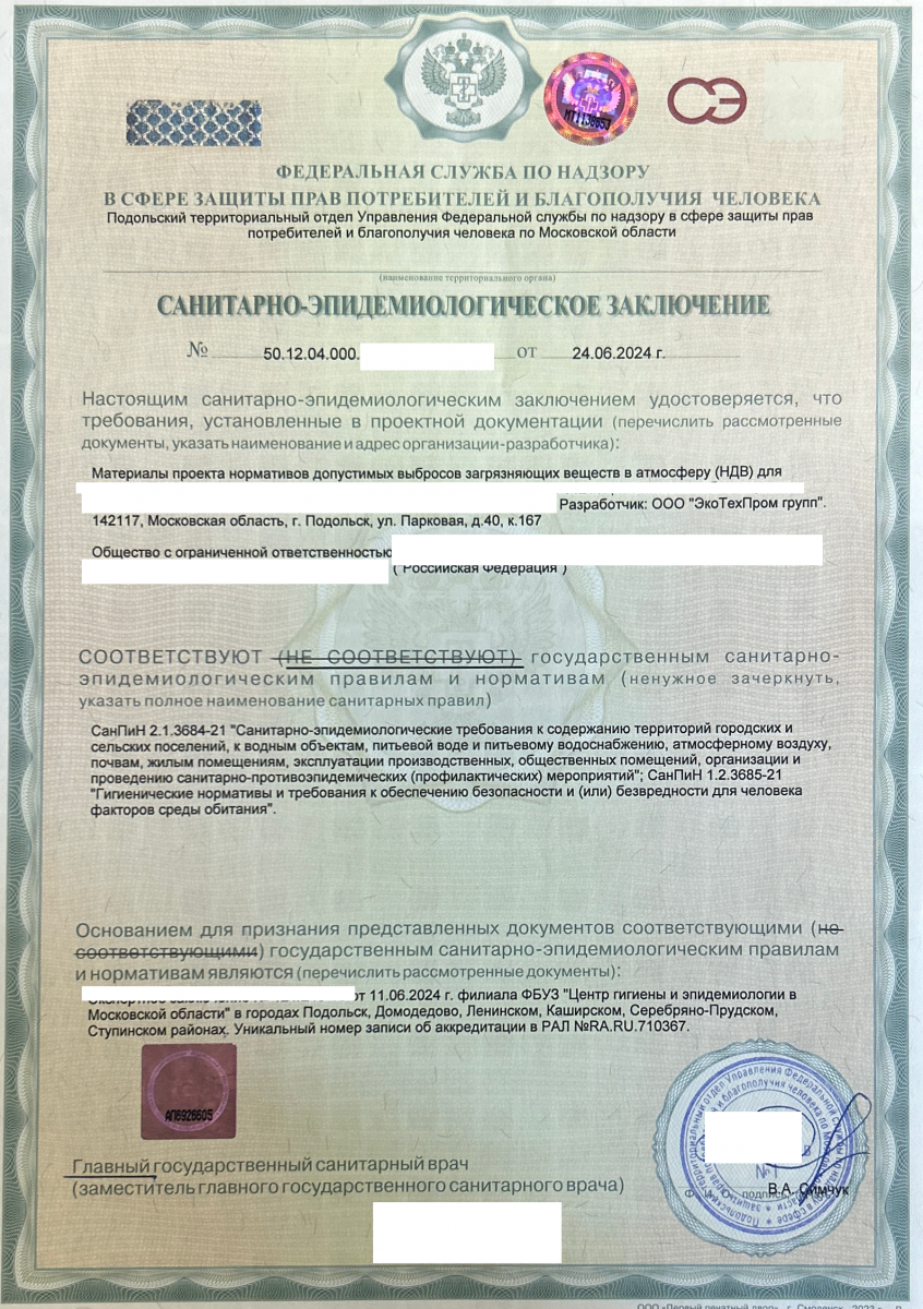 Сотрудники ООО "ЭкоТехПром групп" получили ряд документов на разработаннные проекты со стороны Управления Роспотребнадзора, а также ФБУЗ Центр гигиены и эпидемиологии. Так проект санитарно-защитной зоны для действующего предприятия в г. Москве, успешно прошел государственную экспертизу и получил положительное экспертное заключение. Еще один проект СЗЗ для действующего предприятия в Московской области также получил положительное экспертное заключение от областного Центра гигиены и эпидемиологии. Проект НДВ после успешной экспертизы получил положительное санитарно-эпидемиологическое заключение от территориального Управления Роспотребнадзора. И еще положительная новость для нашего клиента, ранее утвержденные границы санитарно-защитной зоны, встали на учет в роскадастр и отображаются на публичной кадастровой карте.