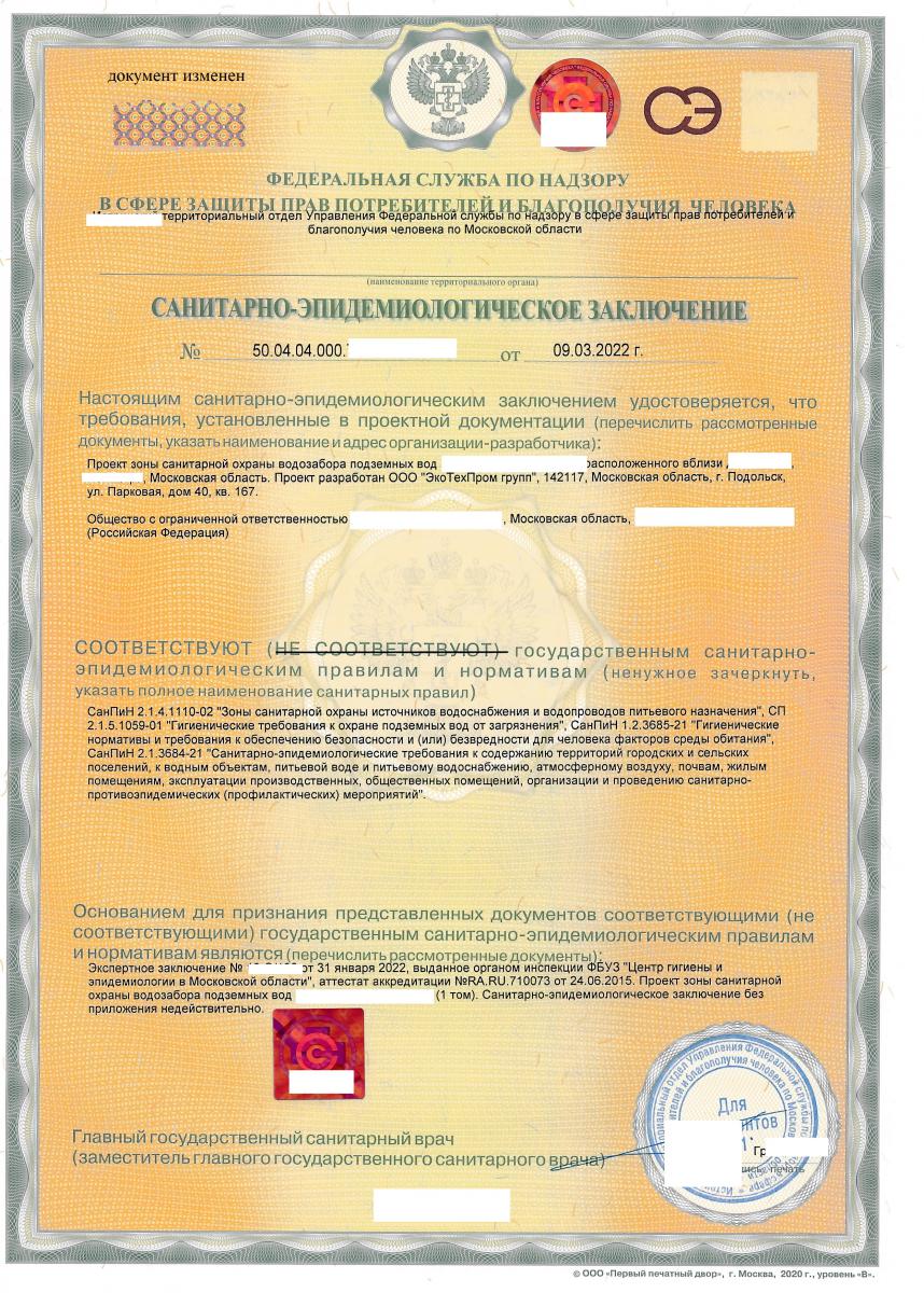 Наши сотрдники успешно согласовали Проект зоны санитарной охраны (ЗСО) скважины с питьевой водой, для промышленного предприятия Московской области. Сотрудники ООО "ЭкоТехПром групп" обладают всеми необходимыми знаниями и колоссальным опытом для согласования проектов ЗСО и СЗЗ, о чем свидетельствует полученное санитарно-эпидемиологическое заключение от Территориального отдела Роспотребнадзора