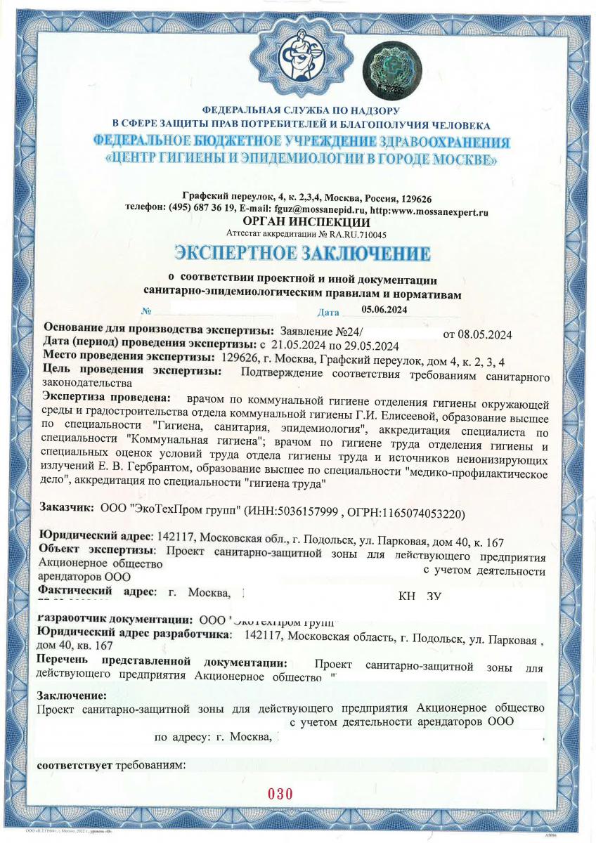 Положительно прошли государственную экспертизу во ФБУЗ "Центр гигиены и эпидемиологии в г. Москве". Разработанный нашими сотрудниками проект санитарно-защитной зоны, получил положительное экспертное заключение. Санитарно защитная зона разрабатывалась для одного из самых крупных мясоперерабатывающих заводов г. Москвы, работа была тяжелая, проект состоит из 4х огромных томов, экспертное заключение составило аж 39 страниц, но опытные сотрудники ООО "ЭкоТехПром групп" конечно же справились с данной задачей и получили положительный результат. На данный момент санитарно-защитная зона проходит утверждение в Управлении Роспотребнадзора, который вынесет Решение об установленных границах данной СЗЗ.