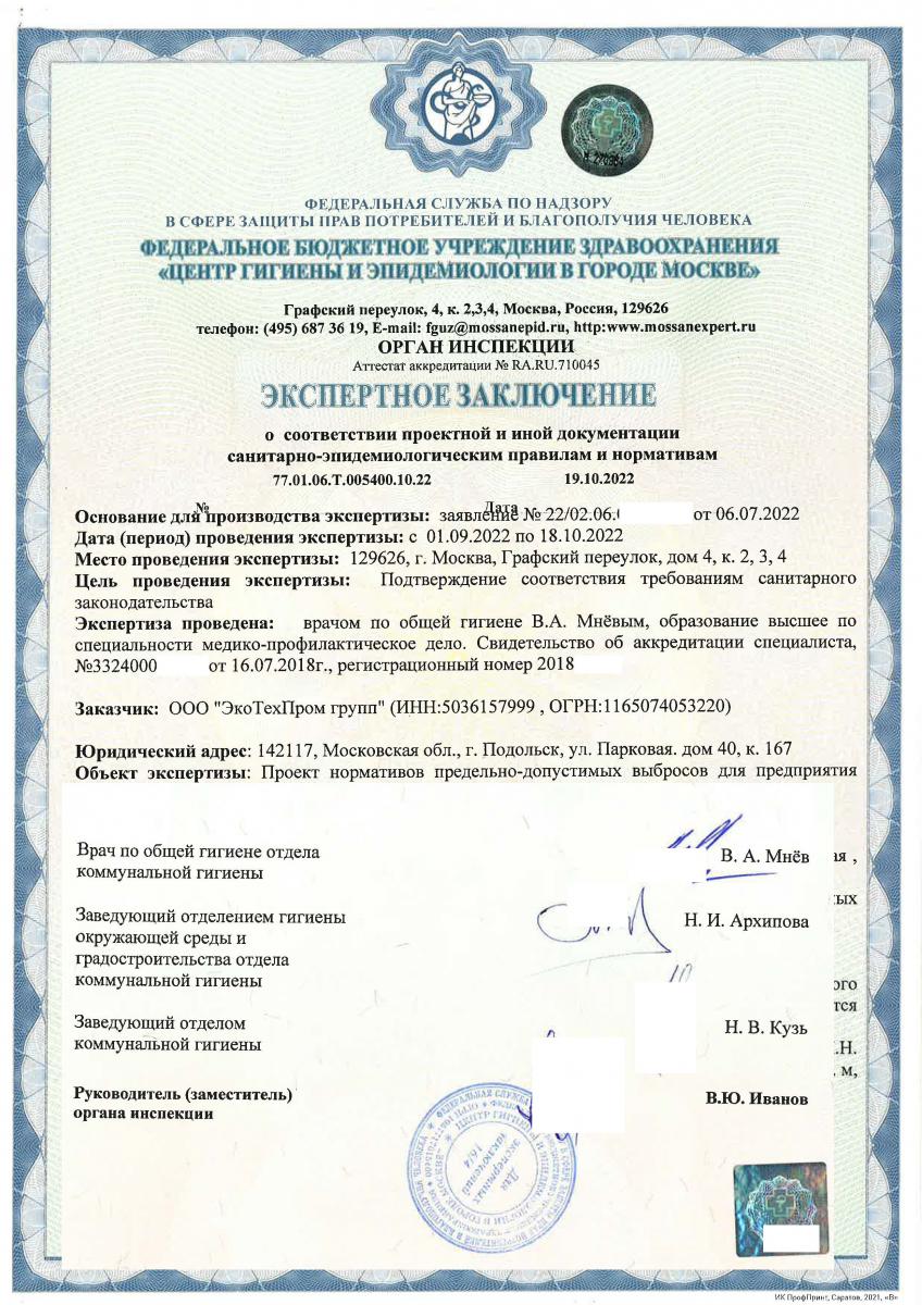 Специалисты ООО "ЭкоТехПром групп" в очередной раз успешно прошли экспертизу в Московском ФБУЗ "Центр гигиены и эпидемиологии". На разработанный нашей компанией Проект ПДВ, выдано положительное экспертное заключение. Далее Проект будет подан на согласование в Управление Роспотребнадзора по г. Москве для получения санитарно-эпидемиологического заключения.