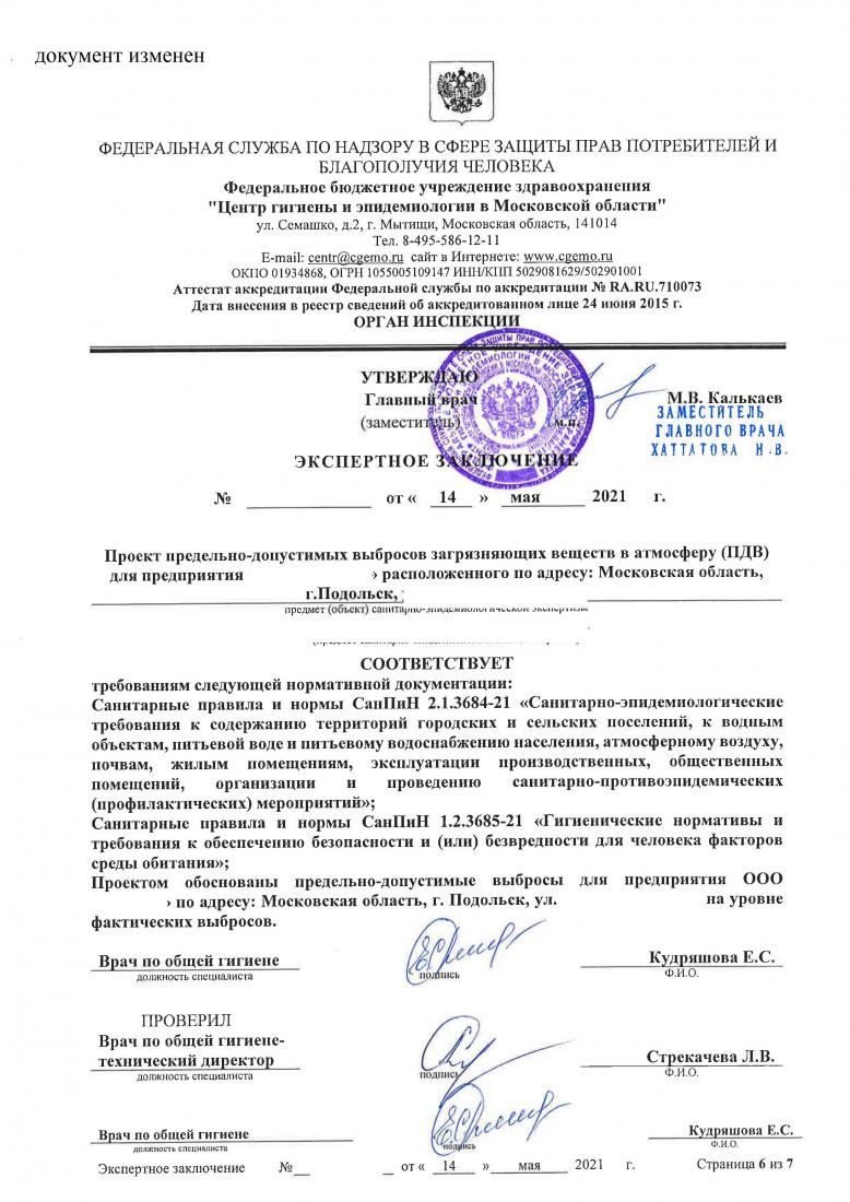 Разработанный ООО "ЭкоТехПром групп" проект нормативов допустимых выбросов успешно прошел экспертизу во ФБУЗ "Центр гигиены и эпидемиологии"