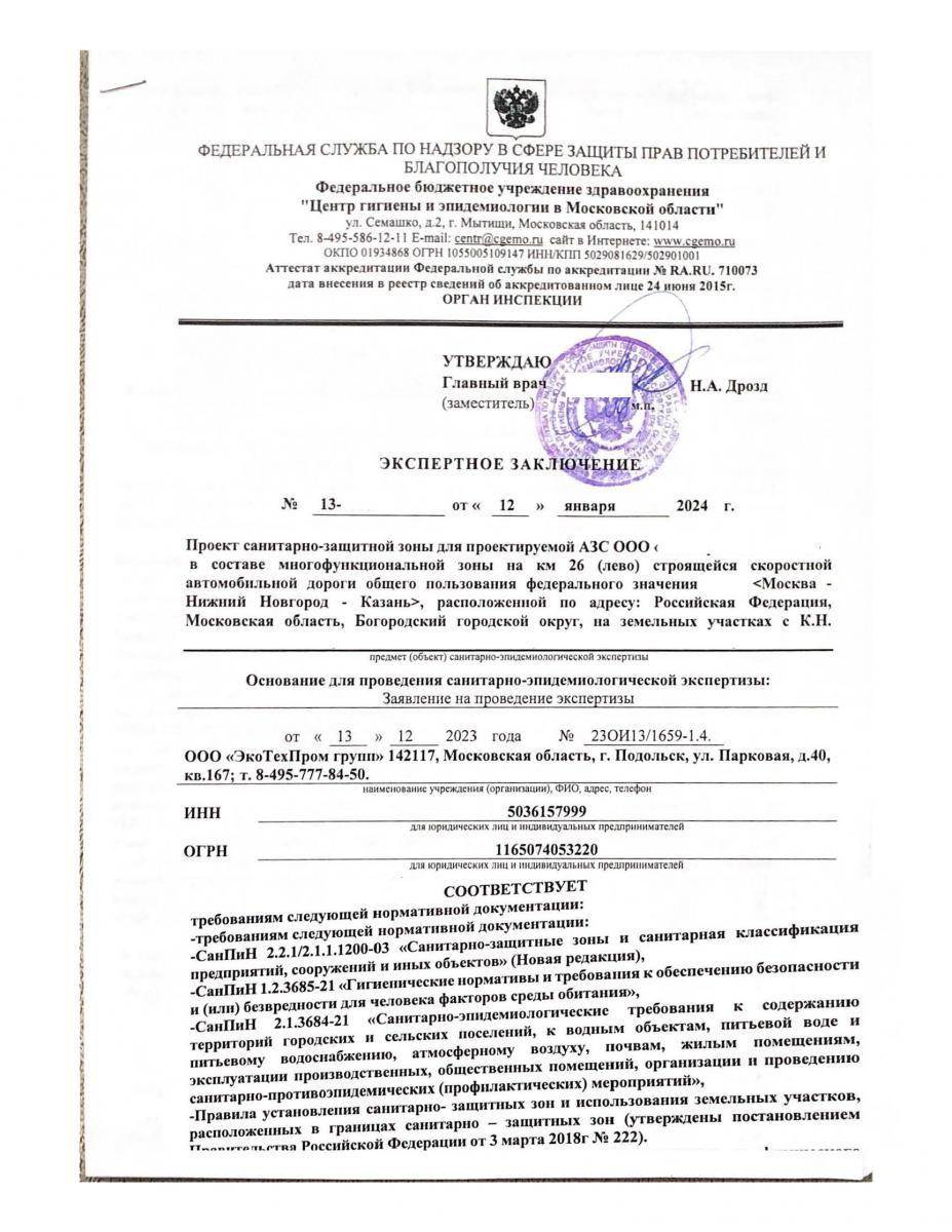 Специалисты ООО "ЭкоТехПром групп" успешно прошли государственную экспертизу проекта санитарно-защитной зоны (СЗЗ) в ФБУЗ "ЦГиЭ в Московской области" для проектируемой АЗС в пределах Московской области. Данная работа была нестандартная, т.к. данная АЗС планируется в составе комплексной застройки с учетом совеременных требований. Наши инженеры справились на отлично, что подтверждается положительным экспертным заключением. Далее материалы рассмотрит Управление Роспотребнадзора по Московской области и вынесет свое Решение.