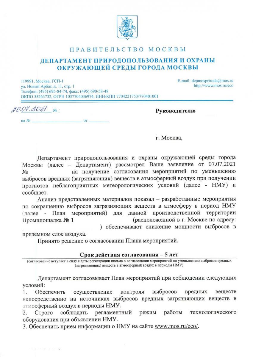Департамент природопользования и охраны окружающей среды г. Москвы успешно согласовал мероприятия по сокращению выбросов в период неблагоприятных метеорологических условий (НМУ) для 2х объектов. Вся документация, разработанная ООО "ЭкоТехПром групп", успешно проходит согласование в надзорных органах.