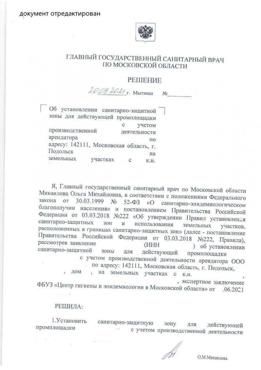 Специалисты ООО "ЭкоТехПромГрупп" получили решение от главного государственного санитарного врача по Московской области на установку санитарно-защитной зоны для действующей промплощадки.